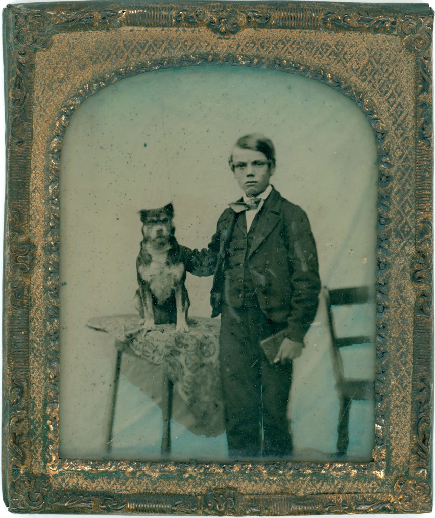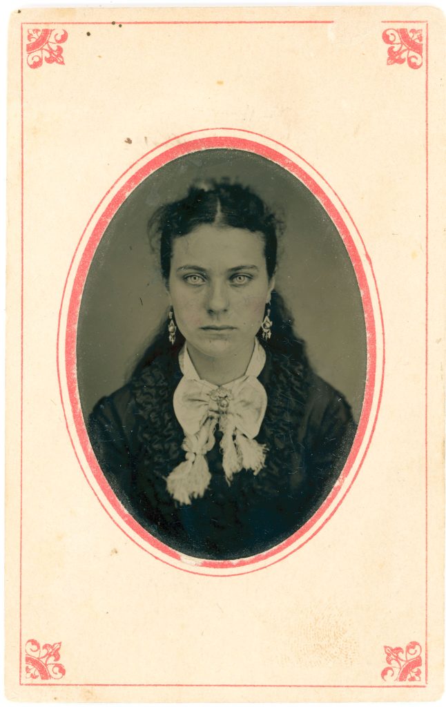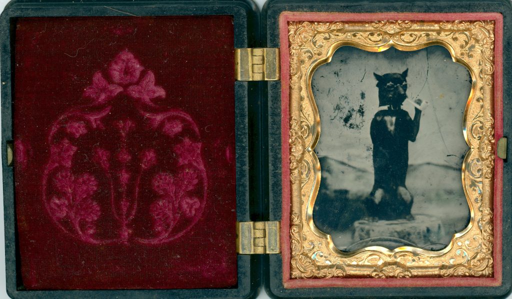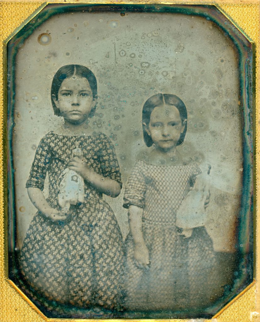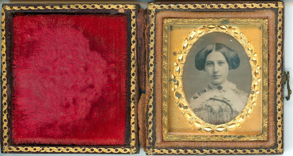 - 암브로타입(Ambrotype) 콜로디온 감광액을 바른 유리판에 만든 습판 ‘음화’를 검은 배경과 결합해 양화처럼 보이게 한 초상. 섬세한 피부 톤과 케이스 장식이 특징.